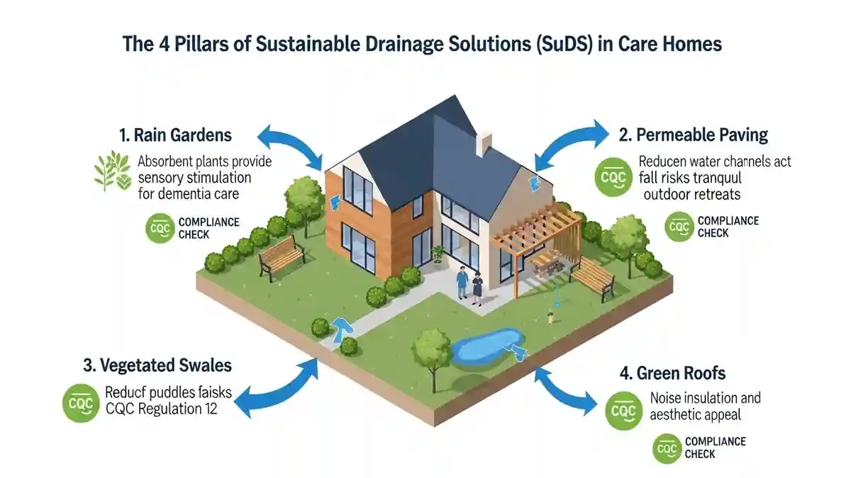 The future of sustainable drainage solutions CQC care home design is the integration of SuDS (Sustainable Drainage Systems). In Alton, Policy EN18 of the Local Plan encourages SuDS to manage surface water runoff, which often plagues the surrounding area.